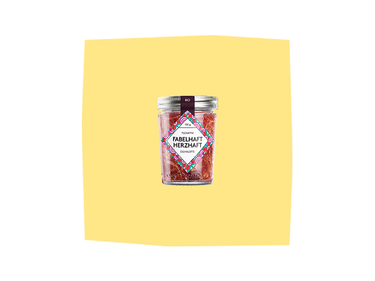 Diesem Glas entspringt der volle Geschmack von frischen Eschalotten, kombiniert mit hausgemachtem Karamell-Rotwein-Essig und würzigen Pflanzen Extrakten. Dieses Tschatni, das uns bei der Herstellung jedes Mal zu Tränen rührt, überzeugt durch seine Palette an unterschiedlichen Geschmacksempfindungen und schenkt fabelhaft-herzhafte Gaumenfreuden.