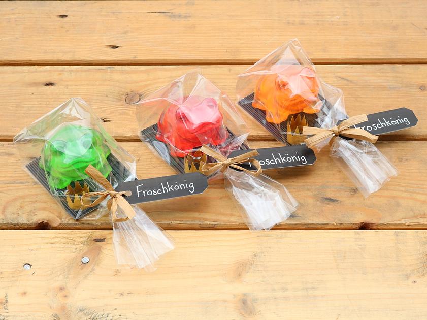Unsere bunten Frösche bringen Farbe ins Badezimmer. Liebevoll verpackt im Cellosäckle mit Krone und Anhänger "Froschkönig". Gewicht ca. 100g.
