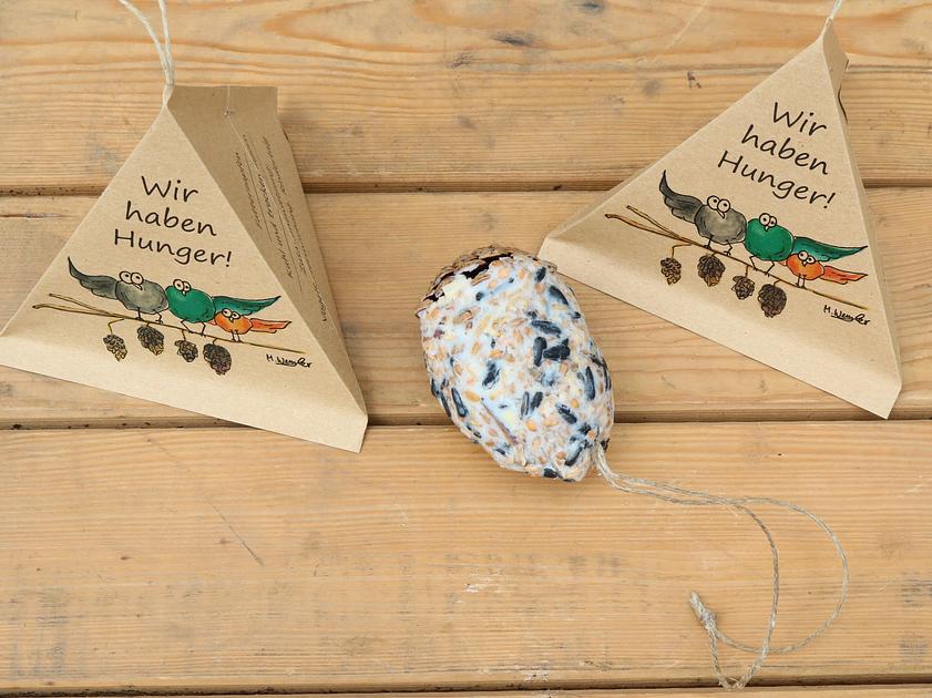 Schwarzföhrenzapfen gefüllt mit einer Mischung aus Kernen und Rindertalg. Auf Balkon, Terrasse und Garten ein Leckerbissen für viele Vogelarten. Erhältlich in liebevoll gestalteter Dreieckstüte oder schmuckem 3er Pack.