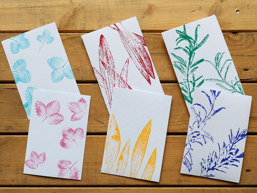 Naturdrucke auf handgeschöpftem Papier. Kartenserie mit 6 unterschiedlichen Motiven. Format 17x12 cm. Jeder Karte wird mit Kuvert geliefert und ist auch einzeln erhältlich.