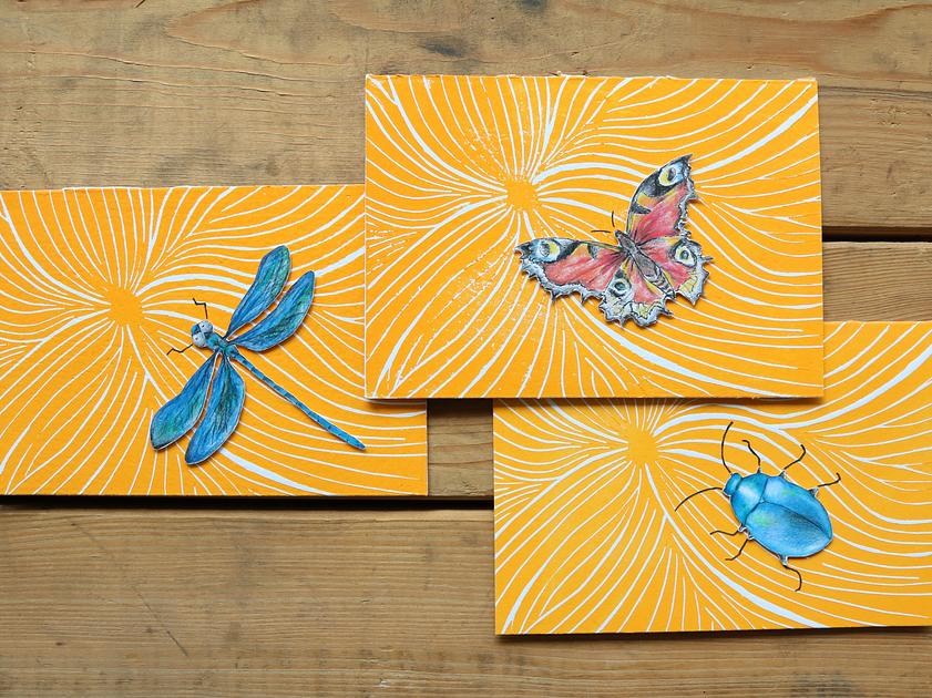 Linoldruck auf handgeschöpftem Papier, Sujet Druck auf Kartonage, Serie mit 6 Karten. Format 17x12 cm. Jeder Karte wird mit Kuvert geliefert und ist auch einzeln erhältlich.