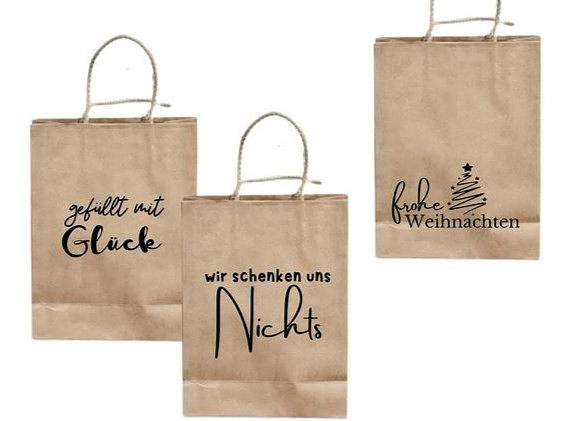 Ob zu Weihnachten, Ostern, zum Geburtstag oder einfach nur so: Unsere liebevoll gestalteten Papiertaschen mit originellen Aufdrucken machen jedes Geschenk zu etwas Besonderem. Die Taschen bestehen aus stabilem, naturbraunem Kraftpapier und sind mit humorvollen oder herzlichen Sprüchen wie „gefüllt mit Glück“, „wir schenken uns Nichts“, „frohe Weihnachten“ oder „Liebe Grüsse vom Osterhasen“ versehen.