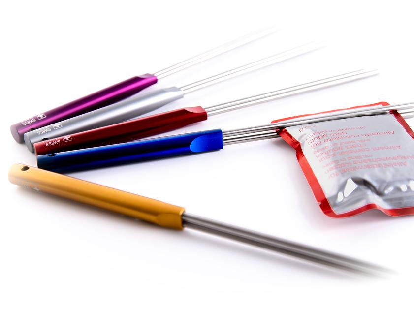Aus Edelstahl und farbig eloxiertem Aluminium. Zum Ausstreifen von Nassfutter-, Flüssigseife- und Fonduebeutel u.v.m