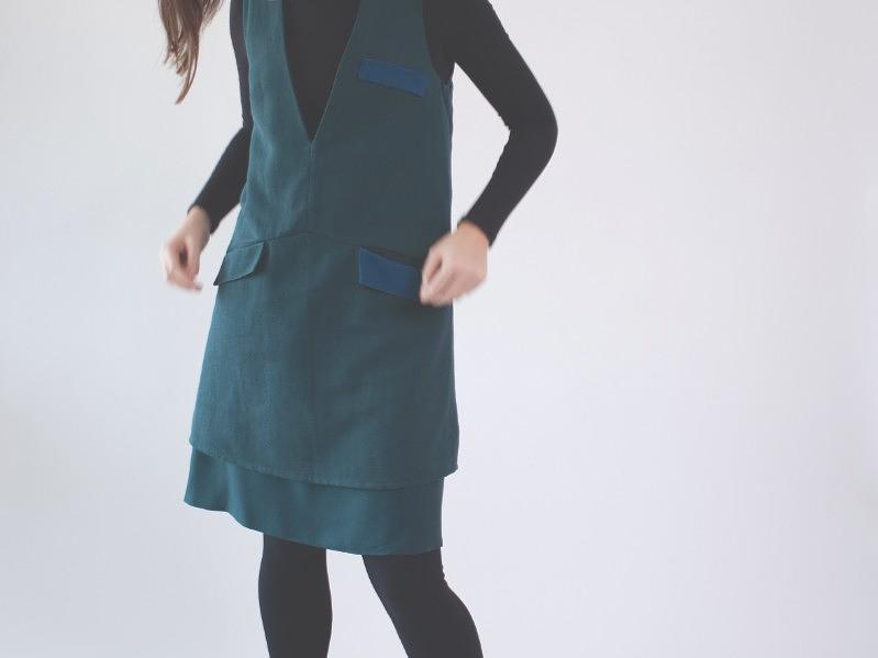 V The VONDERFUL dress is inspired from the housecoat our grandmas wore at home to do the housework. They were comfortable with big pockets to put many handy things – like clothespins – in them. We maintained the comfort and the practical pockets and turned the whole thing into an elegant garment. You can still put pins and rubber bands into the pockets if you wish.. V